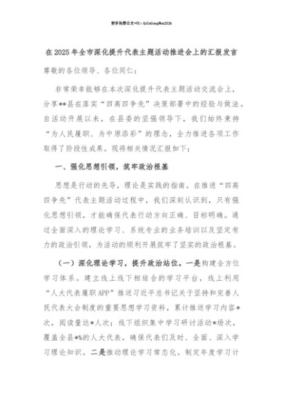 【七哥公文】2025年:【七哥公文】在2025年全市深化提升代表主题活动推进会上的汇报发言+更多免费公文+VX:QiGeGongWen2024+更多免费公文+VX:QiGeGongWen2024