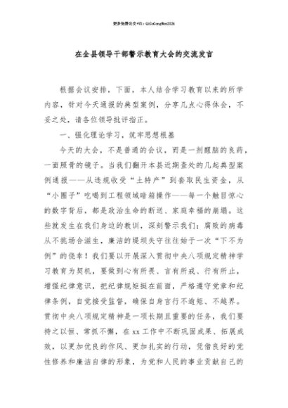 【七哥公文】2025年:【七哥公文】在全县领导干部警示教育大会的交流发言+更多免费公文+VX:QiGeGongWen2024+更多免费公文+VX:QiGeGongWen2024