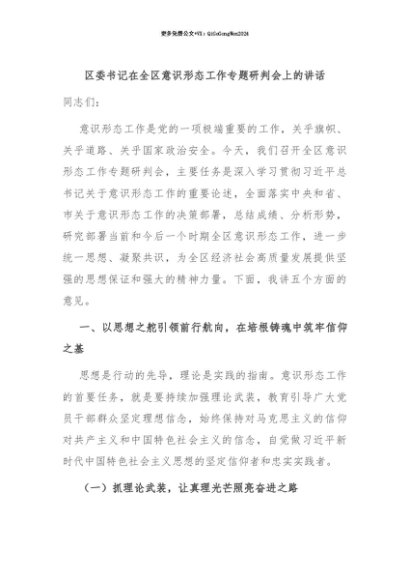 【七哥公文】2025年:【七哥公文】区委书记在全区意识形态工作专题研判会上的讲话+更多免费公文+VX:QiGeGongWen2024+更多免费公文+VX:QiGeGongWen2024