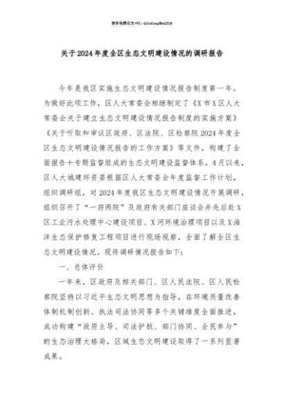 【七哥公文】2025年:【七哥公文】关于2024年度全区生态文明建设情况的调研报告+更多免费公文+VX:QiGeGongWen2024+更多免费公文+VX:QiGeGongWen2024