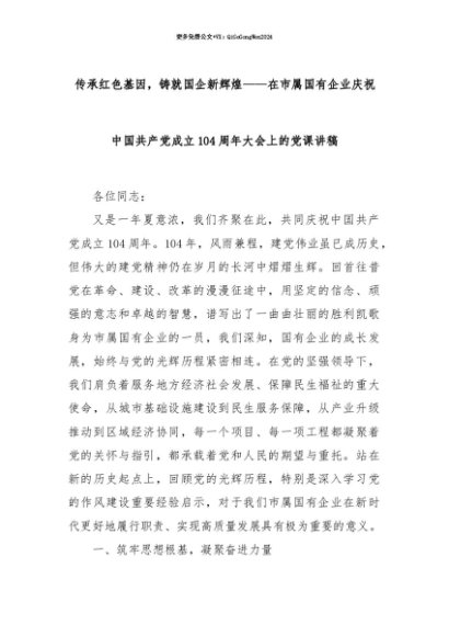 【七哥公文】2025年:【七哥公文】传承红色基因,铸就国企新辉煌——在市属国有企业庆祝中国共产党成立104周年大会上的党课讲稿+更多免费公文+VX:QiGeGongWen2024+更多免费公文+VX:QiGeGongWen2024