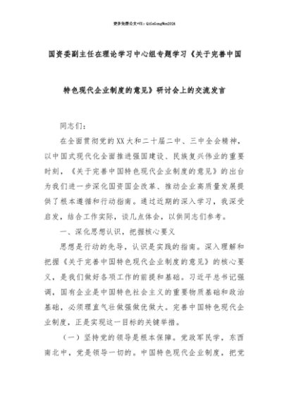 【七哥公文】2025年:【七哥公文】国资委副主任在理论学习中心组专题学习《关于完善中国特色现代企业制度的意见》研讨会上的交流发言+更多免费公文+VX:QiGeGongWen2024+更多免费公文+VX:QiGeGongWen2024