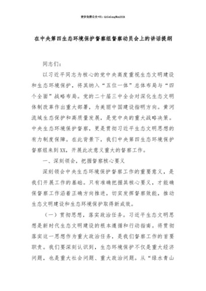 【七哥公文】2025年:【七哥公文】在中央第四生态环境保护督察组督察动员会上的讲话提纲+更多免费公文+VX:QiGeGongWen2024+更多免费公文+VX:QiGeGongWen2024