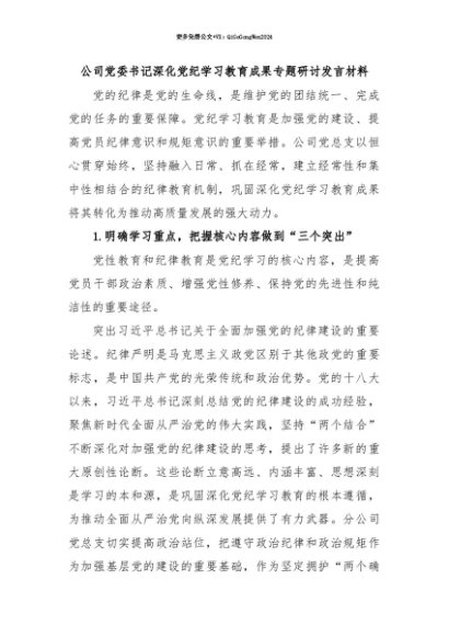 【七哥公文】2025年:【七哥公文】公司党委书记深化党纪学习教育成果专题研讨发言材料+更多免费公文+VX:QiGeGongWen2024+更多免费公文+VX:QiGeGongWen2024