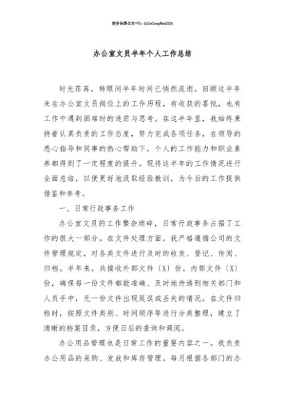 【七哥公文】2025年:【七哥公文】办公室文员半年个人工作总结+更多免费公文+VX:QiGeGongWen2024+更多免费公文+VX:QiGeGongWen2024