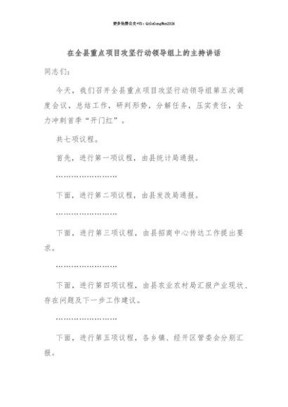 【七哥公文】2025年:【七哥公文】在全县重点项目攻坚行动领导组上的主持讲话+更多免费公文+VX:QiGeGongWen2024+更多免费公文+VX:QiGeGongWen2024