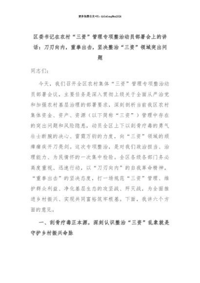 【七哥公文】2025年:【七哥公文】区委书记在农村“三资”管理专项整治动员部署会上的讲话:刀刃向内,重拳出击,坚决整治“三资”领域突出问题+更多免费公文+VX:QiGeGongWen2024+更多免费公文+VX:QiGeGongWen2024