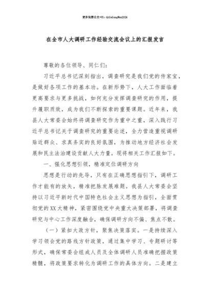 【七哥公文】2025年:【七哥公文】在全市人大调研工作经验交流会议上的汇报发言+更多免费公文+VX:QiGeGongWen2024+更多免费公文+VX:QiGeGongWen2024