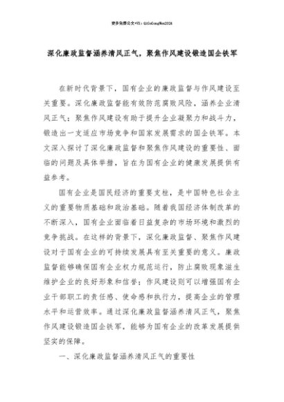 【七哥公文】2025年:【七哥公文】深化廉政监督涵养清风正气,聚焦作风建设锻造国企铁军+更多免费公文+VX:QiGeGongWen2024+更多免费公文+VX:QiGeGongWen2024