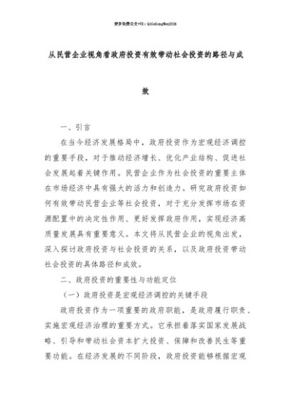 【七哥公文】2025年:【七哥公文】从民营企业视角看政府投资有效带动社会投资的路径与成效+更多免费公文+VX:QiGeGongWen2024+更多免费公文+VX:QiGeGongWen2024