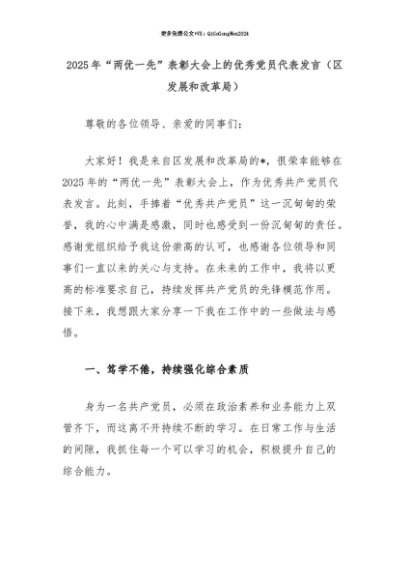 【七哥公文】2025年:【七哥公文】2025年“两优一先”表彰大会上的优秀党员代表发言(区发展和改革局)+更多免费公文+VX:QiGeGongWen2024+更多免费公文+VX:QiGeGongWen2024