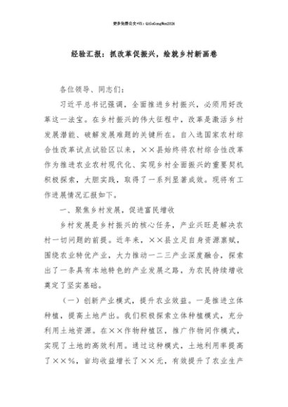 【七哥公文】2025年:【七哥公文】经验汇报:抓改革促振兴,绘就乡村新画卷+更多免费公文+VX:QiGeGongWen2024+更多免费公文+VX:QiGeGongWen2024
