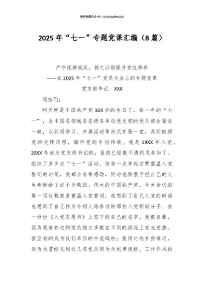【七哥公文】2025年:【七哥公文】(8篇)2025年“七一”专题党课汇编+更多免费公文+VX:QiGeGongWen2024+更多免费公文+VX:QiGeGongWen2024