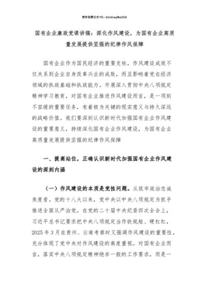 【七哥公文】2025年:【七哥公文】国有企业廉政党课讲稿:深化作风建设,为国有企业高质量发展提供坚强的纪律作风保障+更多免费公文+VX:QiGeGongWen2024+更多免费公文+VX:QiGeGongWen2024