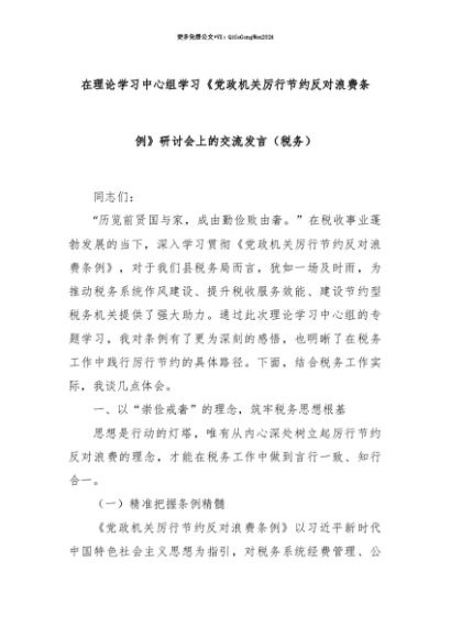 【七哥公文】2025年:【七哥公文】在理论学习中心组学习《党政机关厉行节约反对浪费条例》研讨会上的交流发言(税务)+更多免费公文+VX:QiGeGongWen2024+更多免费公文+VX:QiGeGongWen2024
