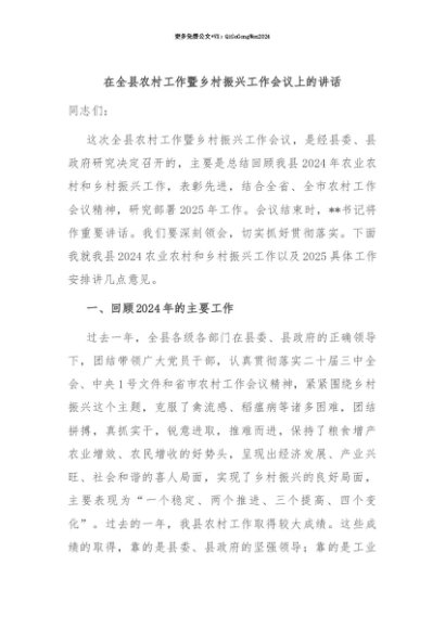 【七哥公文】2025年:【七哥公文】在全县农村工作暨乡村振兴工作会议上的讲话+更多免费公文+VX:QiGeGongWen2024+更多免费公文+VX:QiGeGongWen2024