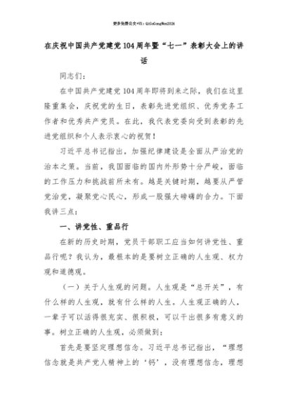 【七哥公文】2025年:【七哥公文】在庆祝中国共产党建党104周年暨“七一”表彰大会上的讲话+更多免费公文+VX:QiGeGongWen2024+更多免费公文+VX:QiGeGongWen2024