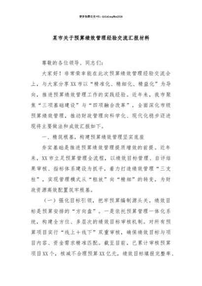 【七哥公文】2025年:【七哥公文】某市关于预算绩效管理经验交流汇报材料+更多免费公文+VX:QiGeGongWen2024+更多免费公文+VX:QiGeGongWen2024