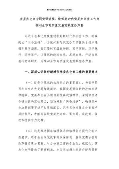 【七哥公文】2025年:【七哥公文】市委办公室专题党课讲稿:做好新时代党委办公室工作为推动全市高质量发展贡献党办力量+更多免费公文+VX:QiGeGongWen2024+更多免费公文+VX:QiGeGongWen2024