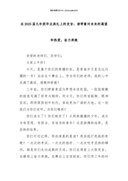 【七哥公文】2025年:【七哥公文】在2025届九年级毕业典礼上的发言:请带着对未来的渴望和热爱,奋力奔跑+更多免费公文+VX:QiGeGongWen2024+更多免费公文+VX:QiGeGongWen2024