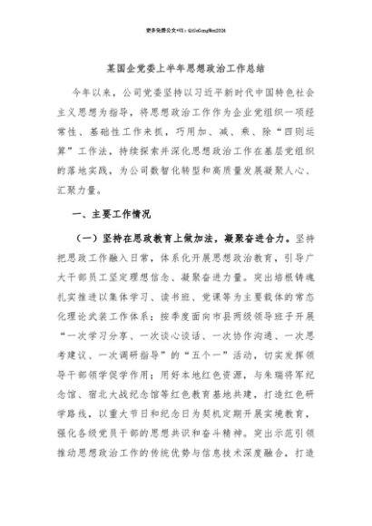 【七哥公文】2025年:【七哥公文】某国企党委上半年思想政治工作总结+更多免费公文+VX:QiGeGongWen2024+更多免费公文+VX:QiGeGongWen2024