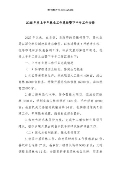 【七哥公文】2025年:【七哥公文】2025年度上半年林业工作总结暨下半年工作安排+更多免费公文+VX:QiGeGongWen2024+更多免费公文+VX:QiGeGongWen2024