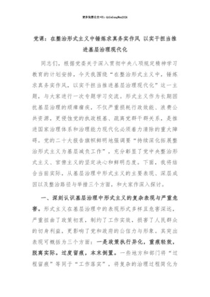 【七哥公文】2025年:【七哥公文】党课:在整治形式主义中锤炼求真务实作风 以实干担当推进基层治理现代化+更多免费公文+VX:QiGeGongWen2024+更多免费公文+VX:QiGeGongWen2024