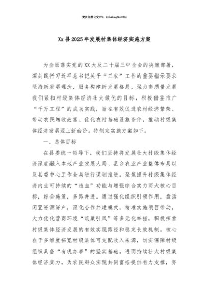 【七哥公文】2025年:【七哥公文】Xx县2025年发展村集体经济实施方案+更多免费公文+VX:QiGeGongWen2024+更多免费公文+VX:QiGeGongWen2024