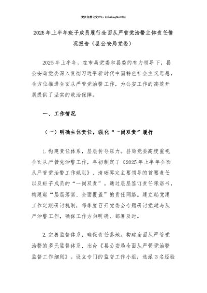 【七哥公文】2025年:【七哥公文】2025年上半年班子成员履行全面从严管党治警主体责任情况报告(县公安局党委)+更多免费公文+VX:QiGeGongWen2024+更多免费公文+VX:QiGeGongWen2024