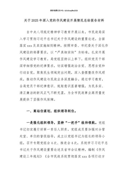【七哥公文】2025年:【七哥公文】关于2025年深入党的作风建设开展情况总结报告材料+更多免费公文+VX:QiGeGongWen2024+更多免费公文+VX:QiGeGongWen2024