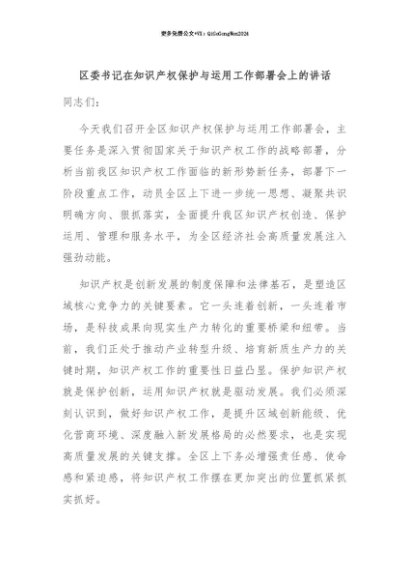 【七哥公文】2025年:【七哥公文】区委书记在知识产权保护与运用工作部署会上的讲话+更多免费公文+VX:QiGeGongWen2024+更多免费公文+VX:QiGeGongWen2024