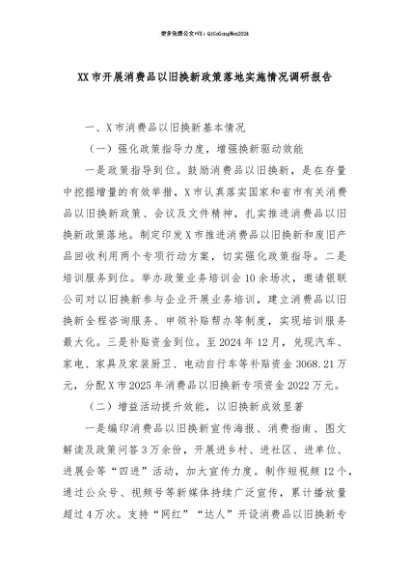 【七哥公文】2025年:【七哥公文】XX市开展消费品以旧换新政策落地实施情况调研报告+更多免费公文+VX:QiGeGongWen2024+更多免费公文+VX:QiGeGongWen2024