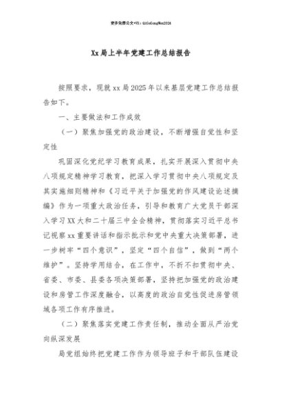 【七哥公文】2025年:【七哥公文】Xx局上半年党建工作总结报告+更多免费公文+VX:QiGeGongWen2024+更多免费公文+VX:QiGeGongWen2024