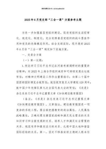 【七哥公文】2025年:【七哥公文】2025年6月党支部“三会一课”方案参考主题+更多免费公文+VX:QiGeGongWen2024+更多免费公文+VX:QiGeGongWen2024