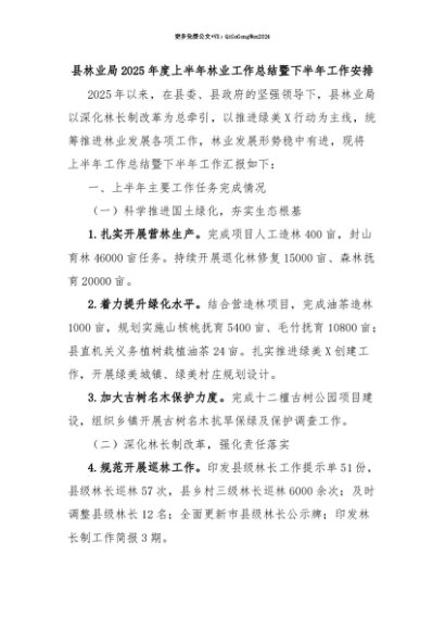 【七哥公文】2025年:【七哥公文】县林业局2025年度上半年林业工作总结暨下半年工作安排+更多免费公文+VX:QiGeGongWen2024+更多免费公文+VX:QiGeGongWen2024