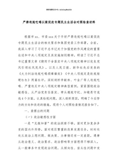 【七哥公文】2025年:【七哥公文】严禁违规吃喝以案促改专题民主生活会对照检查材料+更多免费公文+VX:QiGeGongWen2024+更多免费公文+VX:QiGeGongWen2024