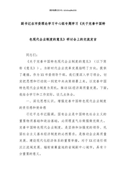 【七哥公文】2025年:【七哥公文】副书记在市委理论学习中心组专题学习《关于完善中国特色现代企业制度的意见》研讨会上的交流发言+更多免费公文+VX:QiGeGongWen2024+更多免费公文+VX:QiGeGongWen2024