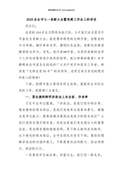 【七哥公文】2025年:【七哥公文】2025在全市七一表彰大会暨党建工作会上的讲话+更多免费公文+VX:QiGeGongWen2024+更多免费公文+VX:QiGeGongWen2024