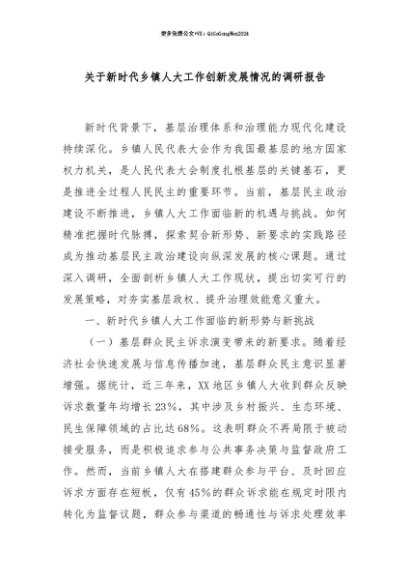 【七哥公文】2025年:【七哥公文】关于新时代乡镇人大工作创新发展情况的调研报告+更多免费公文+VX:QiGeGongWen2024+更多免费公文+VX:QiGeGongWen2024