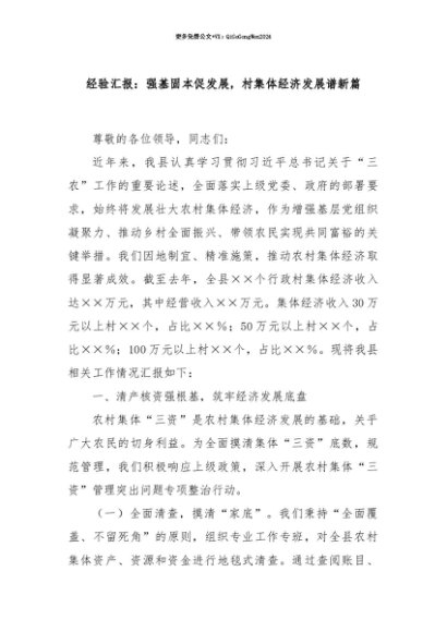 【七哥公文】2025年:【七哥公文】经验汇报:强基固本促发展,村集体经济发展谱新篇+更多免费公文+VX:QiGeGongWen2024+更多免费公文+VX:QiGeGongWen2024