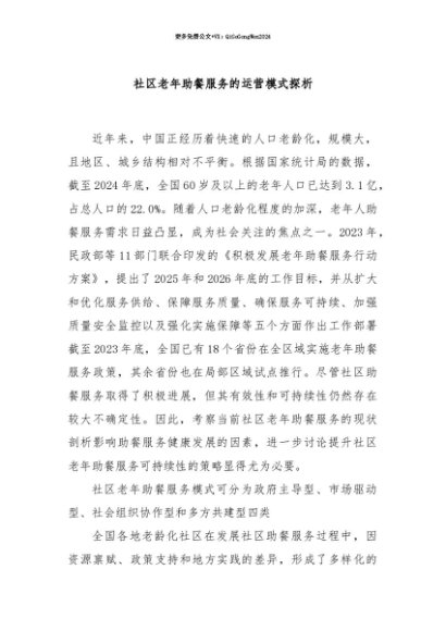 【七哥公文】2025年:【七哥公文】社区老年助餐服务的运营模式探析+更多免费公文+VX:QiGeGongWen2024+更多免费公文+VX:QiGeGongWen2024