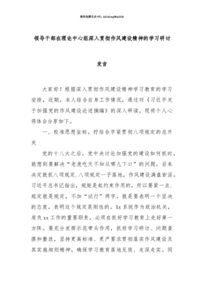 【七哥公文】2025年:【七哥公文】领导干部在理论中心组深入贯彻作风建设精神的学习研讨发言+更多免费公文+VX:QiGeGongWen2024+更多免费公文+VX:QiGeGongWen2024