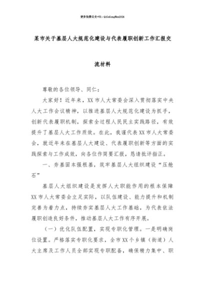 【七哥公文】2025年:【七哥公文】某市关于基层人大规范化建设与代表履职创新工作汇报交流材料+更多免费公文+VX:QiGeGongWen2024+更多免费公文+VX:QiGeGongWen2024