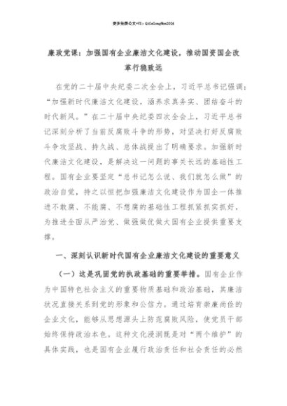 【七哥公文】2025年:【七哥公文】廉政党课:加强国有企业廉洁文化建设,推动国资国企改革行稳致远+更多免费公文+VX:QiGeGongWen2024+更多免费公文+VX:QiGeGongWen2024