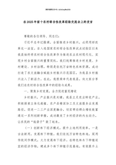 【七哥公文】2025年:【七哥公文】在2025年前十农村综合性改革经验交流会上的发言+更多免费公文+VX:QiGeGongWen2024+更多免费公文+VX:QiGeGongWen2024