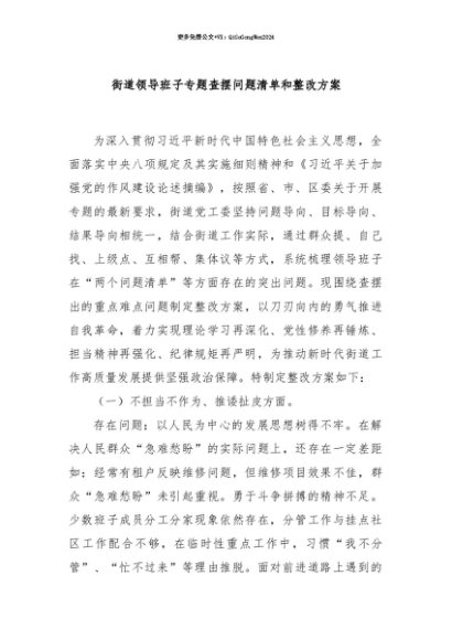 【七哥公文】2025年:【七哥公文】街道领导班子专题查摆问题清单和整改方案+更多免费公文+VX:QiGeGongWen2024+更多免费公文+VX:QiGeGongWen2024