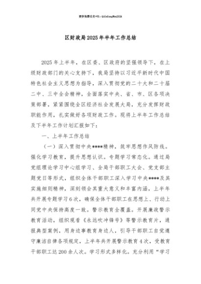 【七哥公文】2025年:【七哥公文】区财政局2025年半年工作总结+更多免费公文+VX:QiGeGongWen2024+更多免费公文+VX:QiGeGongWen2024