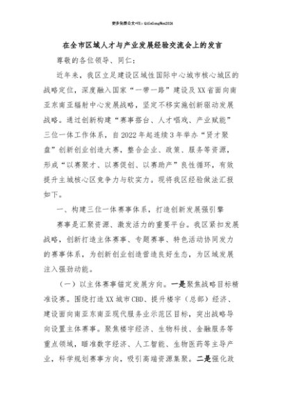 【七哥公文】2025年:【七哥公文】在全市区域人才与产业发展经验交流会上的发言+更多免费公文+VX:QiGeGongWen2024+更多免费公文+VX:QiGeGongWen2024