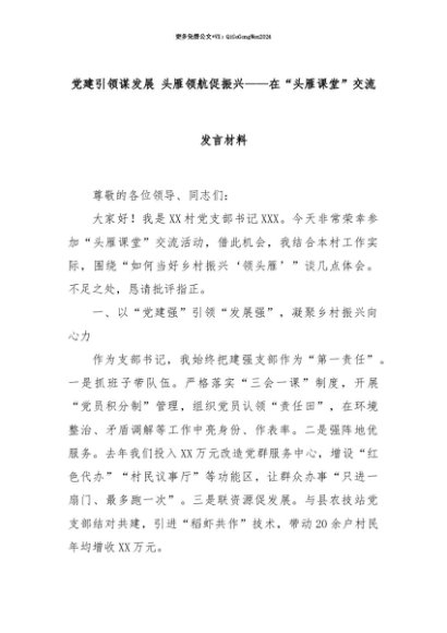 【七哥公文】2025年:【七哥公文】党建引领谋发展 头雁领航促振兴——在“头雁课堂”交流发言材料+更多免费公文+VX:QiGeGongWen2024+更多免费公文+VX:QiGeGongWen2024