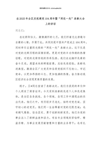 【七哥公文】2025年:【七哥公文】在2025年全区庆祝建党104周年暨“两优一先”表彰大会上的讲话+更多免费公文+VX:QiGeGongWen2024+更多免费公文+VX:QiGeGongWen2024